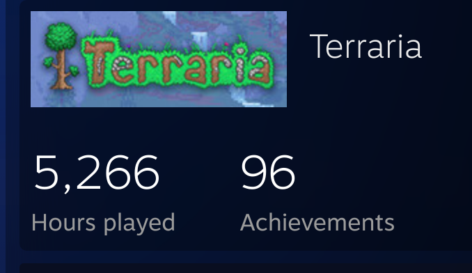 Terraria (2011).. or, well, actually to start, Super Mario Bros X... or, well, actually to start, Super Mario Flash- okay, well, Super Mario Flash wasn't that much to write home about I think looking back, but it satisfied an early desire for level editors that I could poke around at to see what makes a level fun and such. Eventually SMBX pretty much supplanted it for me, as it had way more features, and I really loved playing around with those to feel like a game dev making my little levels and writing NPC dialogue and such. Terraria is a very different game, but it was developed by some of the people who originally worked on SMBX, which is why I got into it. I have 5000 hours on this game because I kept coming back to it a lot, and also forgot to turn off my PC or close the game a fair amount back in the day.